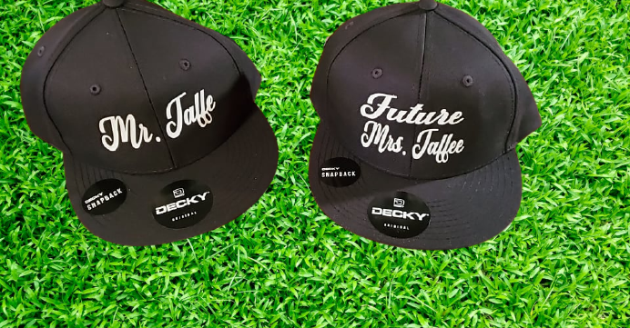 Snapback hat with vinyl letters.